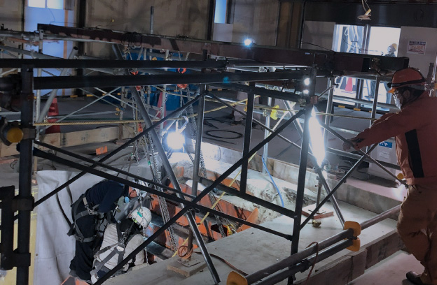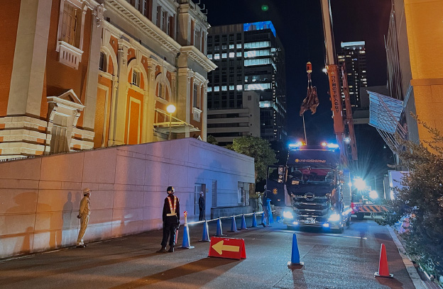 重機を搬入します。高層の建物や現場に重機搬入スペースがない場合、レッカーにて重機を建物の上に吊り上げて搬入します。